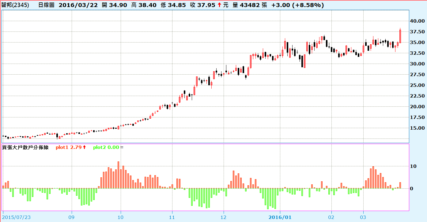從上面這幾張圖就可以發現,我們其實透過散戶與大戶佔買張比例的變化,可以清楚的看到當大戶比重持續上昇時,籌碼被收集後股價都較有表現的機會,反之則都屬於偏空或盤整的格局。