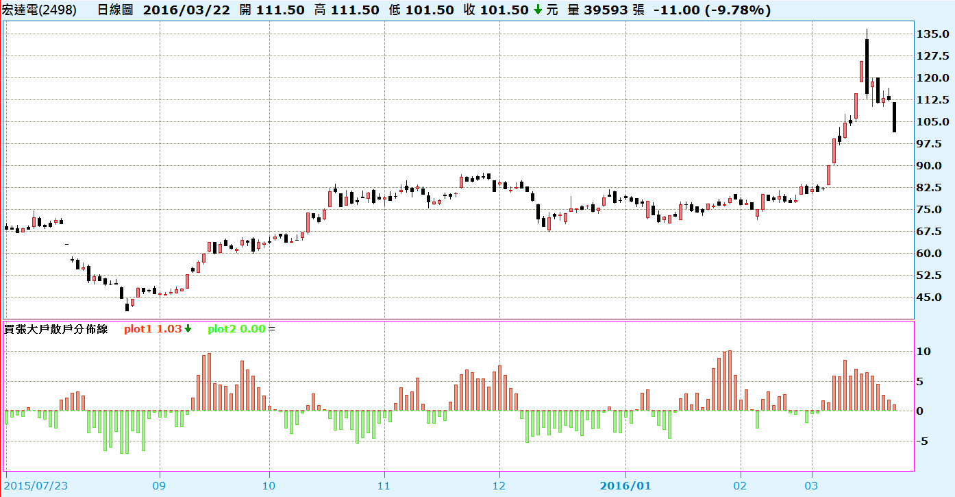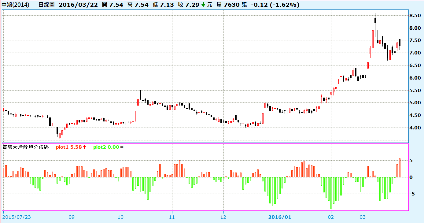 我稱這個指標為買張大戶散戶分佈線,我把最近大家比較關注的股票用這個指標來呈現目前大戶法人主力是站在買方還是賣方?
