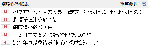 在這個策略裡,要挑的股票除了符合上述的條件外,市值不能太大,股價不能太貴,過去五年有賺錢。