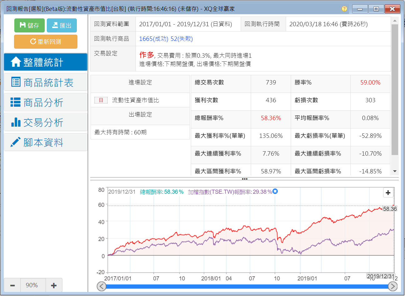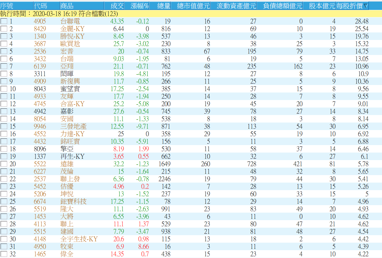 有網友在問說能不能知道那些股票的總市值已經低於流動資產,我寫了一個選股腳本來找出這些股票。不過要跟大家提醒的是,從過去回測的數字來看,這種價值型投資方法,在市場大跌時,股價未必能抗跌,只是在多頭市場,確實有不錯的表現,所以大家可以透過這個選股腳本去找出被低估的股票,但進場點還是得等不確定因素結束,然後也不是折價愈大愈好,還是要考慮公司的未來前景及獲利能力。