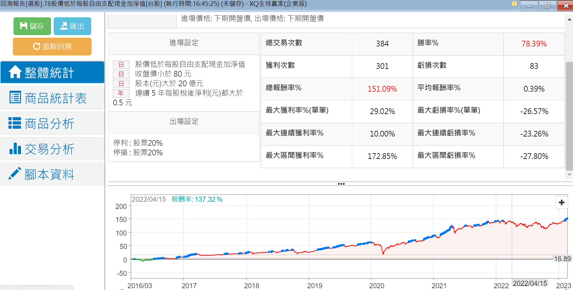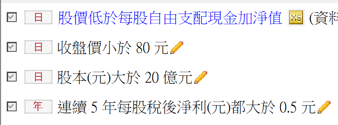 如果每股自由支配現金+每股淨值比股價還高,那就代表股價委屈了,如果比股價高很多,那就是股價超跌了,這個選股策略是去找出這種非常超跌的股票。