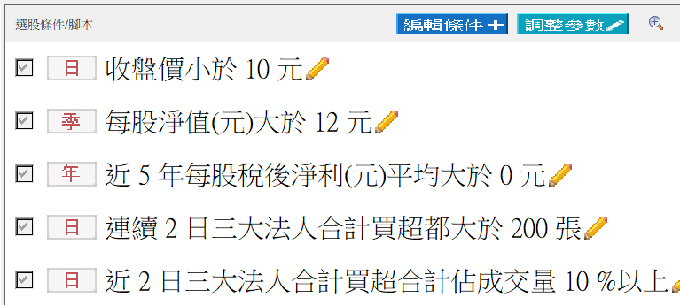 有些朋友專作雞蛋水餃股,今天小弟來貢獻一個專做這類股的操作策略。這個策略的概念是,股價跌破票面,但每股淨值大於12元。這種公司通常業績不怎麼樣,股價才會這麼慘,但這種公司如果過往五年平均還是有賺錢,而且最近2天法人開始大買,就有可能代表這家公司要轉運了。