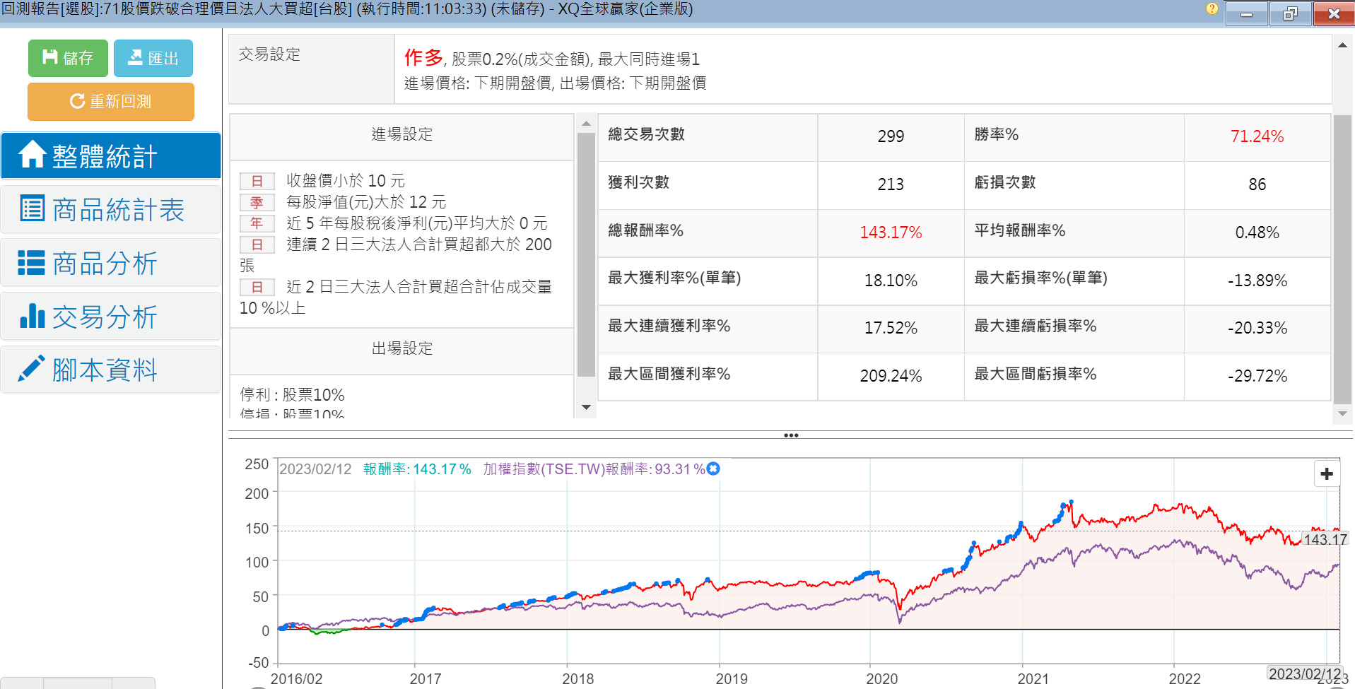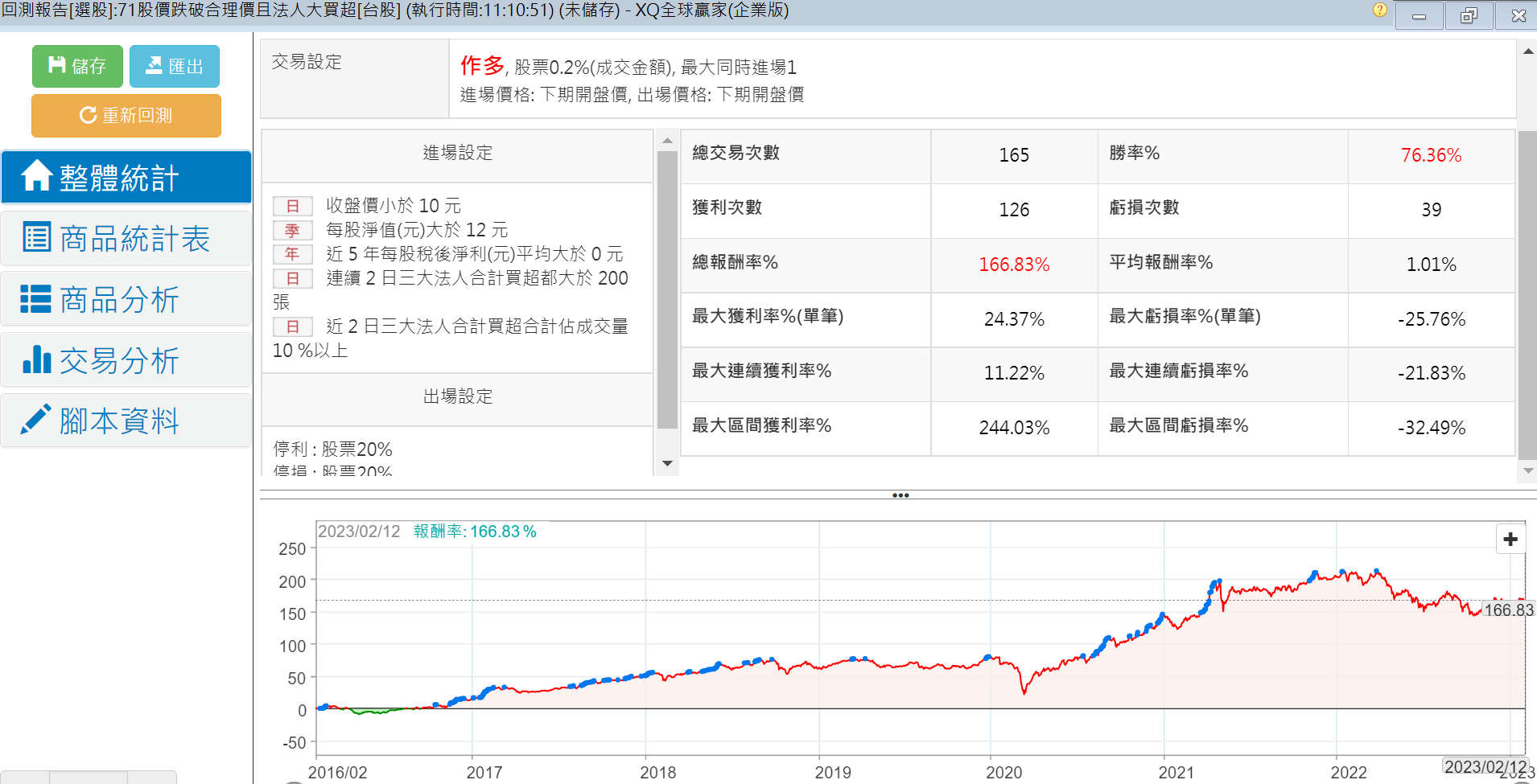 把這個策略拿去回測過去七年,停損停利都設為10%,回測報告如下: