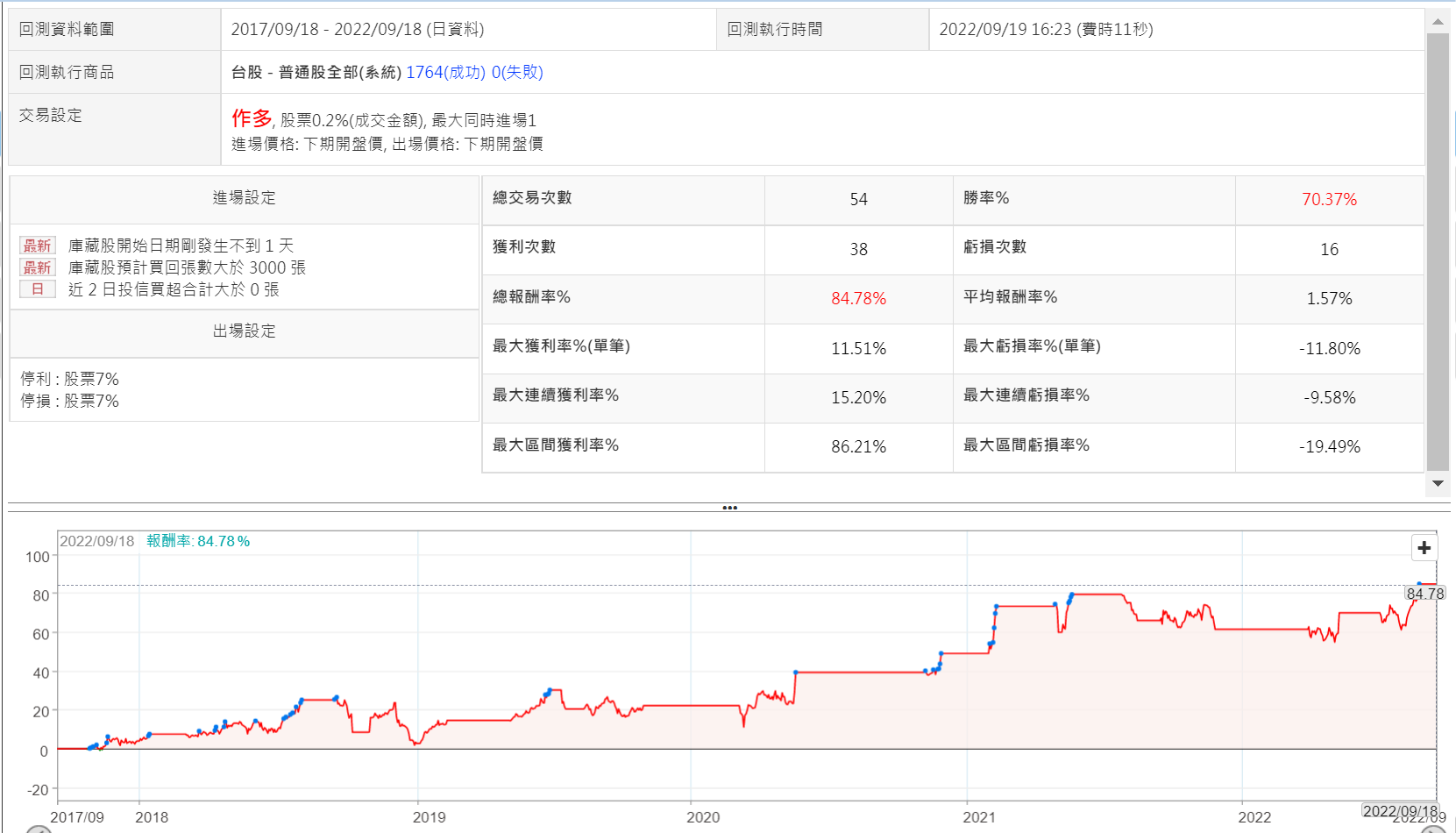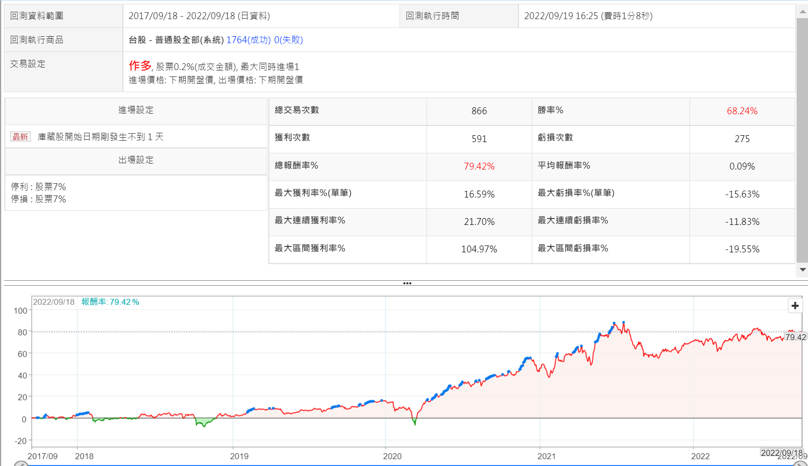 光這個條件下去回測所有股票,停損停利都設7%,過去五年的勝率就達到68%,回測報告如下:
