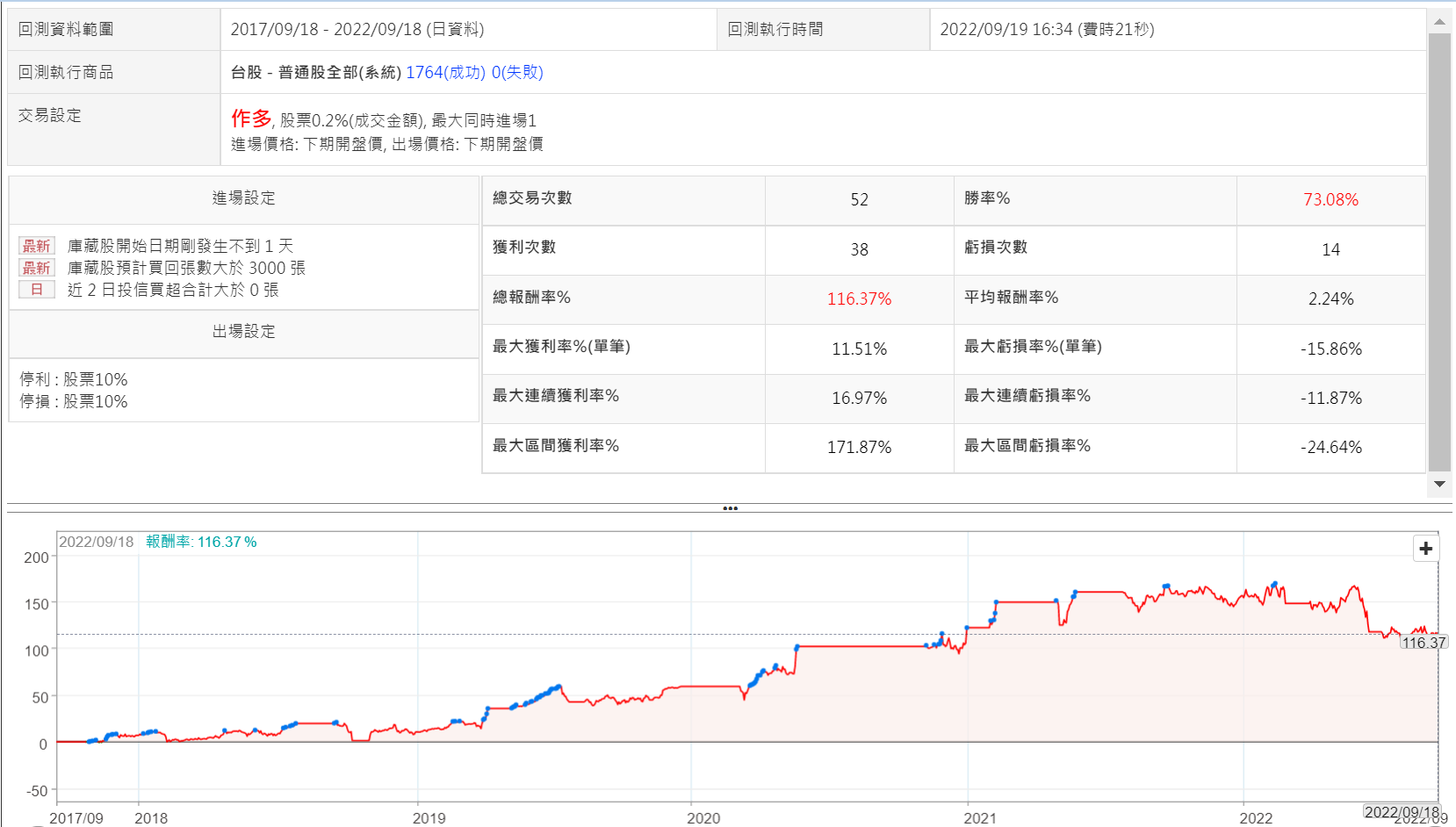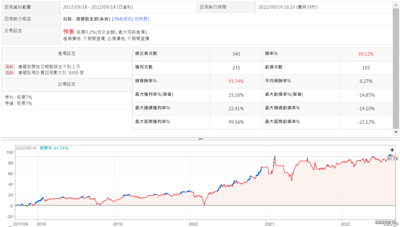 為了提高勝率及總報酬率,我加了一個條件,庫藏股的張數要超過3000張。