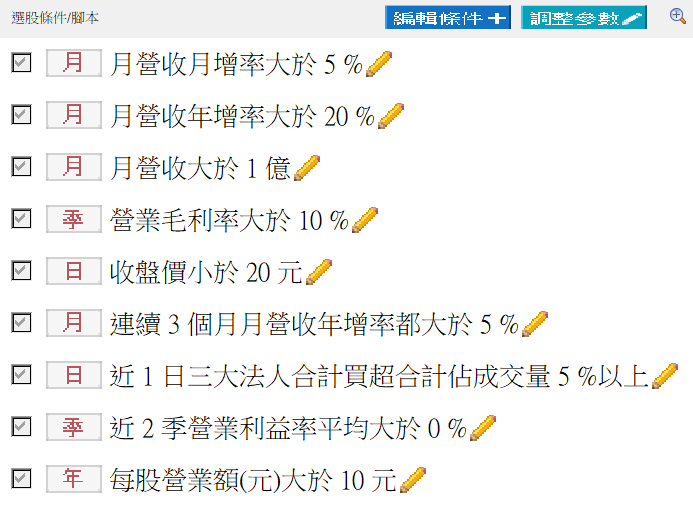 首先,我先試著把前輩的想法,用【XQ選股中心】的條件式,組合出來: