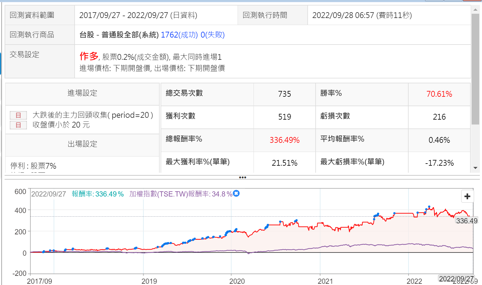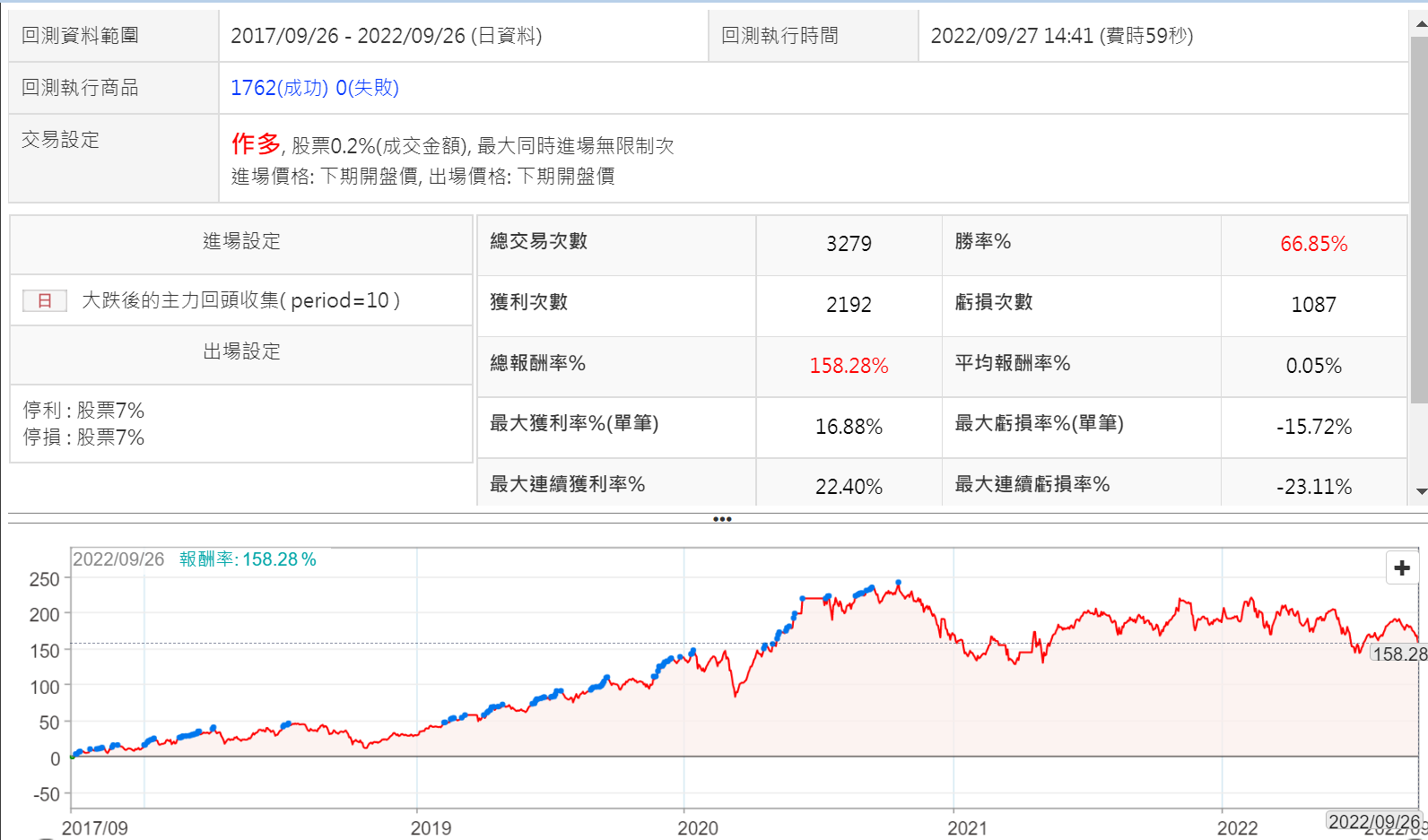 用這個腳本所作的選股策略,如果把它拿來回測過去五年,停損停利設為7%,回測報告如下