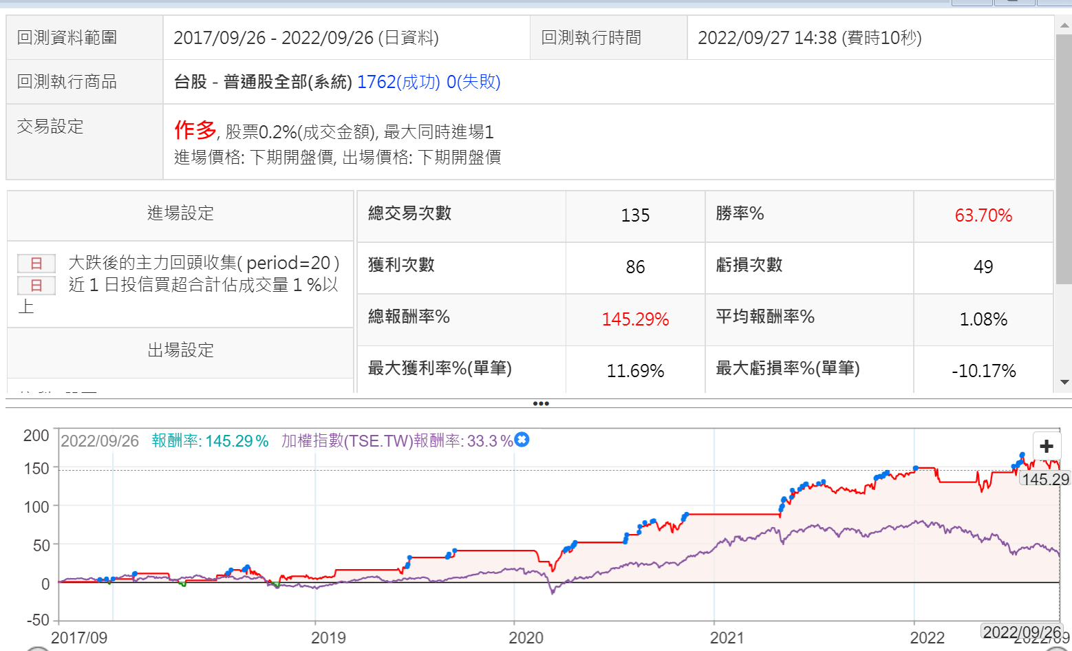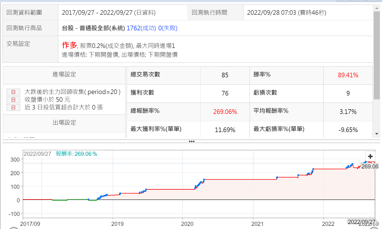 例如股價小於50,加上近3日投信買超合計大於0張,回測報告如下