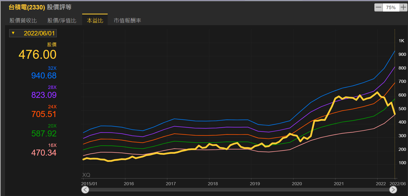 這是股價除以過去四季的EPS總合的值,以台積電為例:
