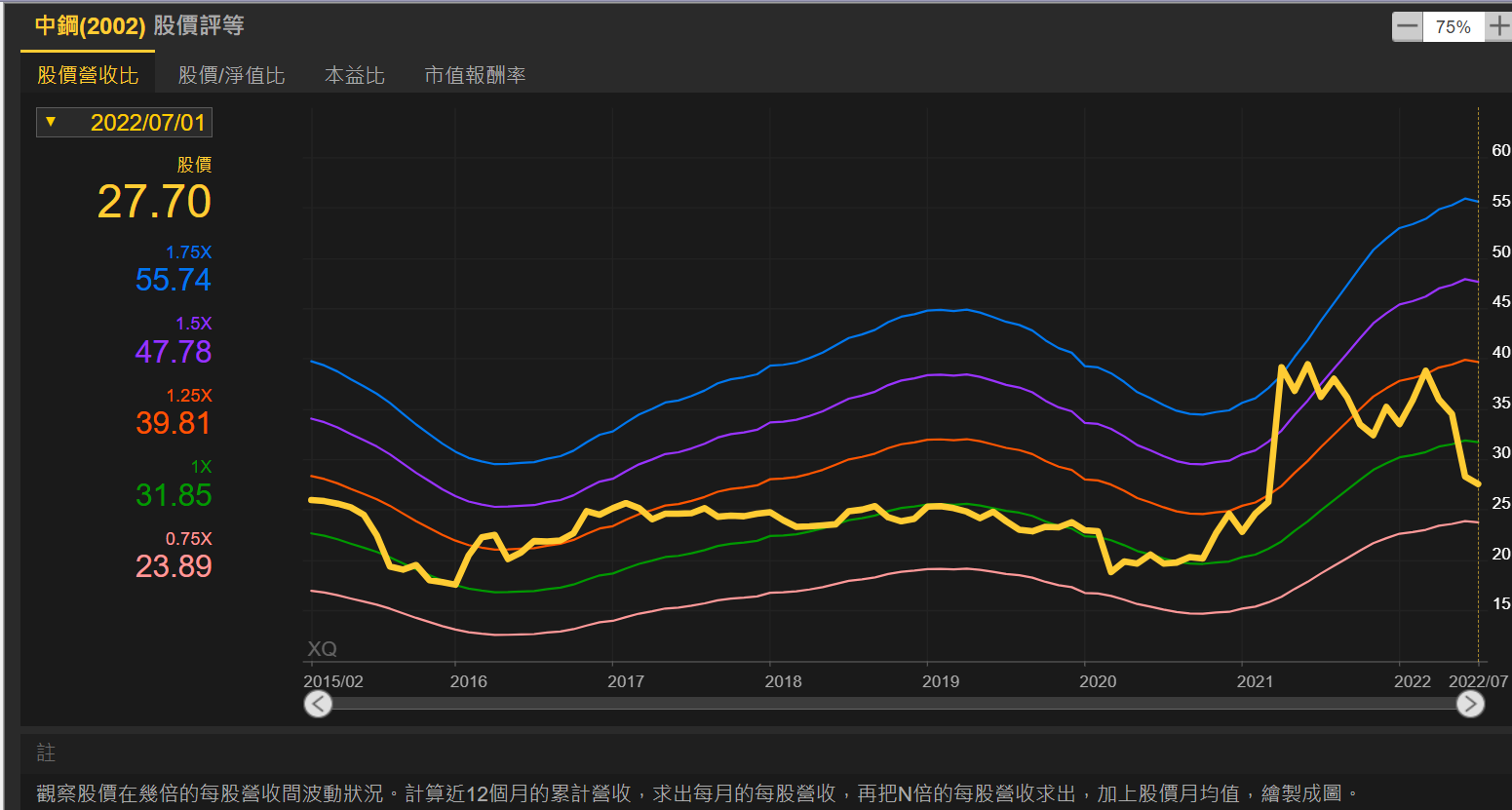 這個估值方式,就是去計算一年做的生意是股票市值的幾倍,我最喜歡用這個方法來衡量景氣循環股的股價底部區。
