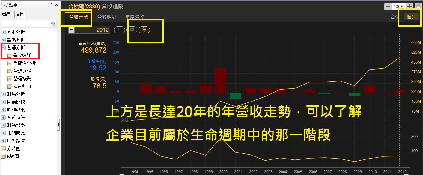 簡單的說,我們可以透過XQ裡的「年度營收長期走勢」,來研判一家公司目前是處於產業生命週期的哪一個階段。