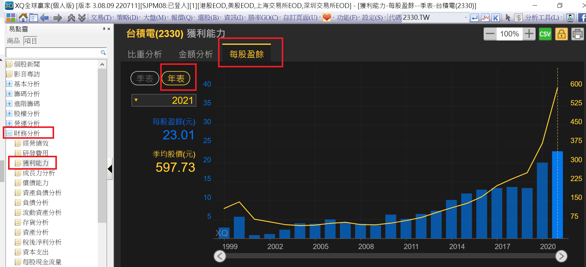 在XQ的個股分析中有一類叫「財務分析」,其中有一項叫「獲利能力」,打開獲利能力後,分成比重分析、金額分析及每股盈餘。