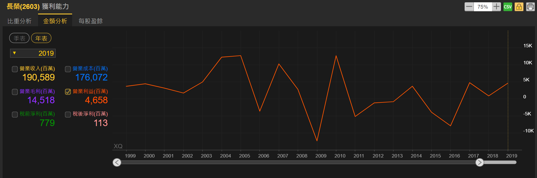 如果點選「金額分析」,選年表,然後勾選「營業利益」,就可以看到一家公司本業的長期走勢。