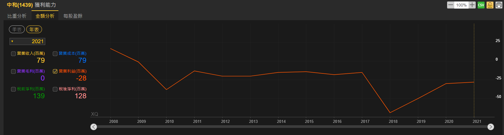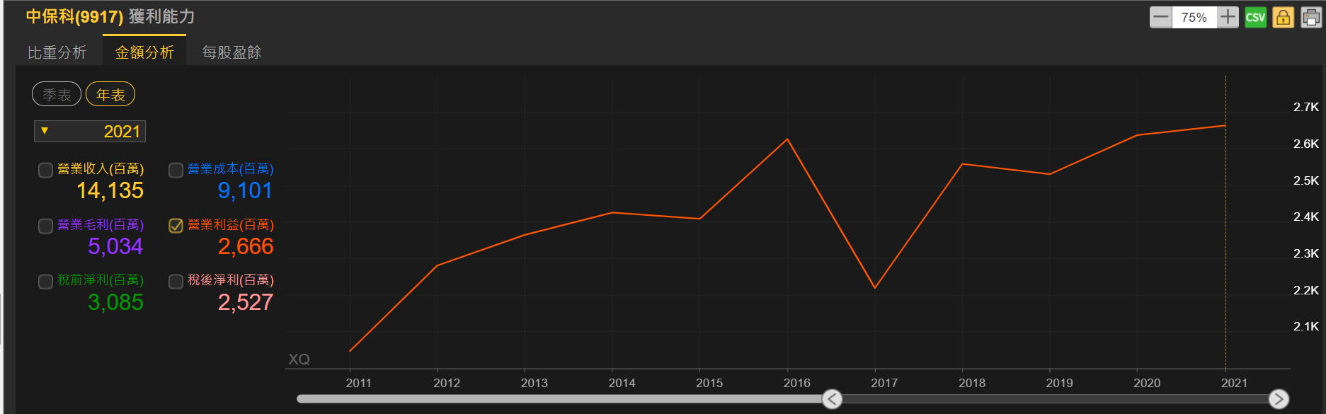 例如上圖的中保科,近十年來每年的獲利大約都在20-25億左右,算是蠻穩定的。