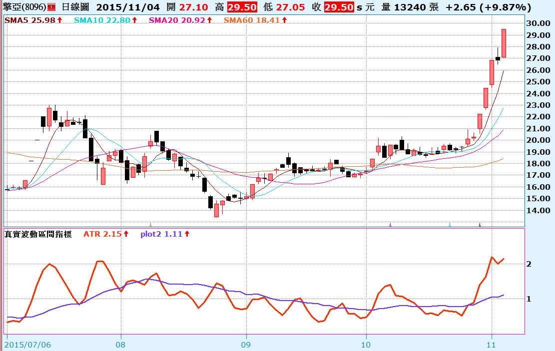 input: Length1(3); input: length2(20); SetInputName(1, "短天數"); setinputname(2,"長天數"); value1 = Average(TrueRange, Length1); value2=average(truerange,length2); Plot1(value1, "ATR"); plot2(value2);