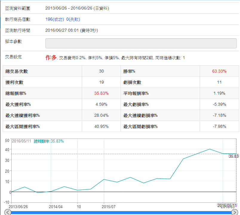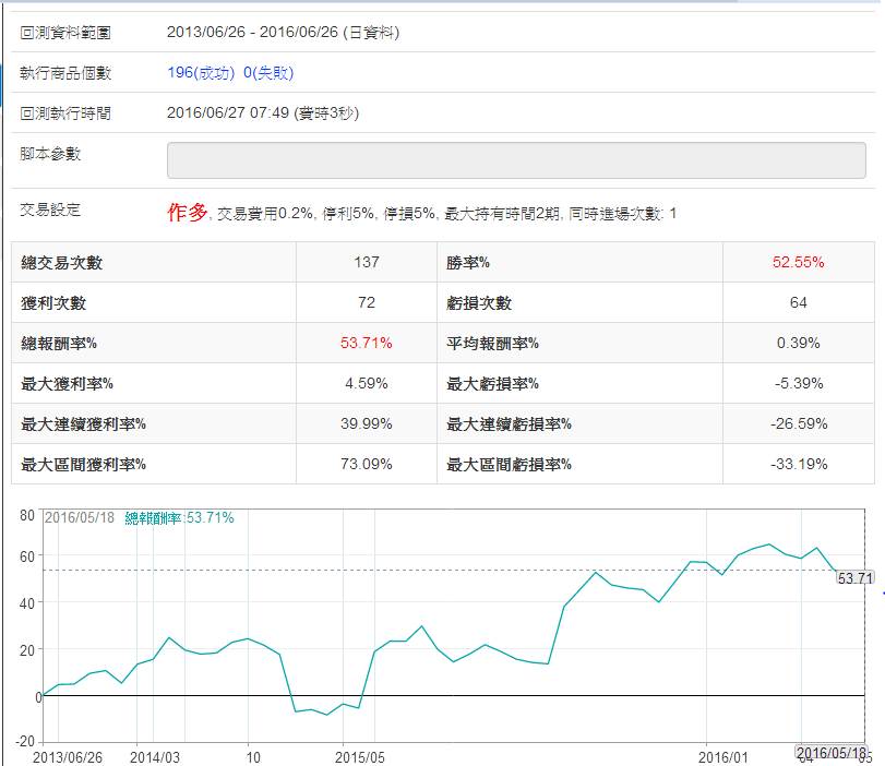 我用的是日線,首先我先前十天的下跌幅度是訂在10%,持有最大期數訂為兩天,然後我用有量的中小型股票去跑,過去三年的回測報告如下: