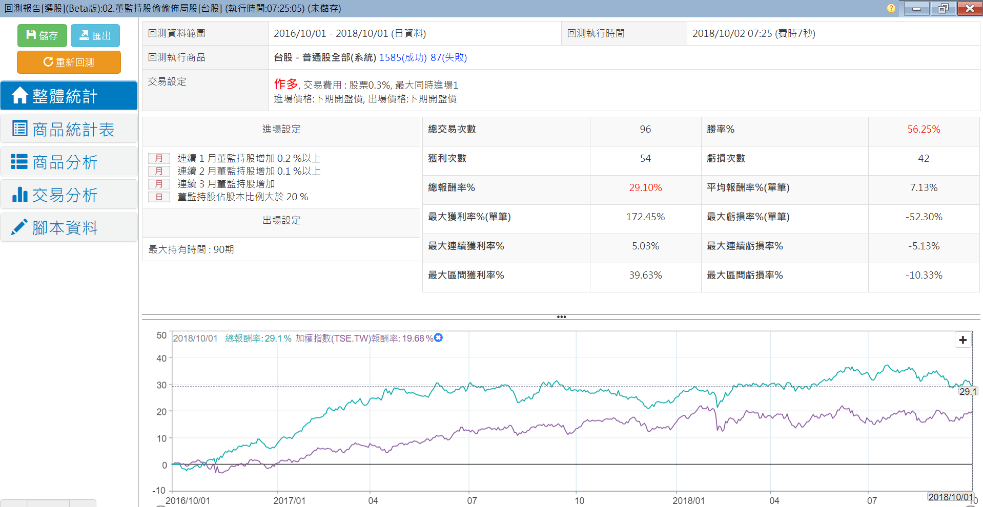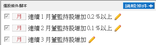 這個選股策略是找出過去三個月,每個月董監持股都在增加,且增加的幅度愈來愈大,這樣是濾掉那些只有單一個月因為特別因素而增加持股的現象,而加碼愈來愈大也代表大股東的心態愈來愈積極。