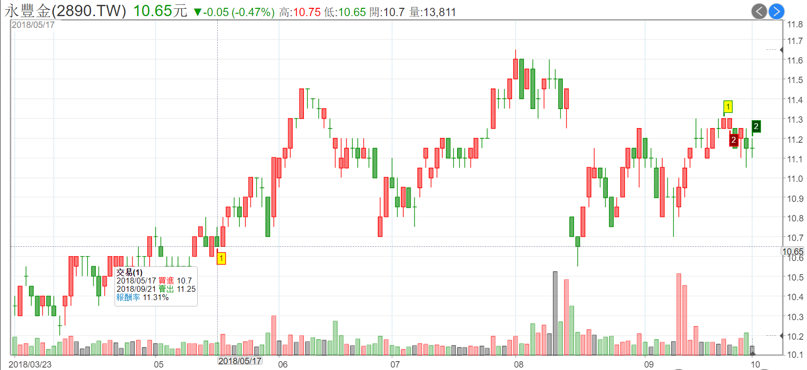 舉個例子來說,永豊金在今年的五月份就符合上述的條件(上面選股條件的增加幅度不是絕對值,是百分比),今年八月又再次符合選股條件