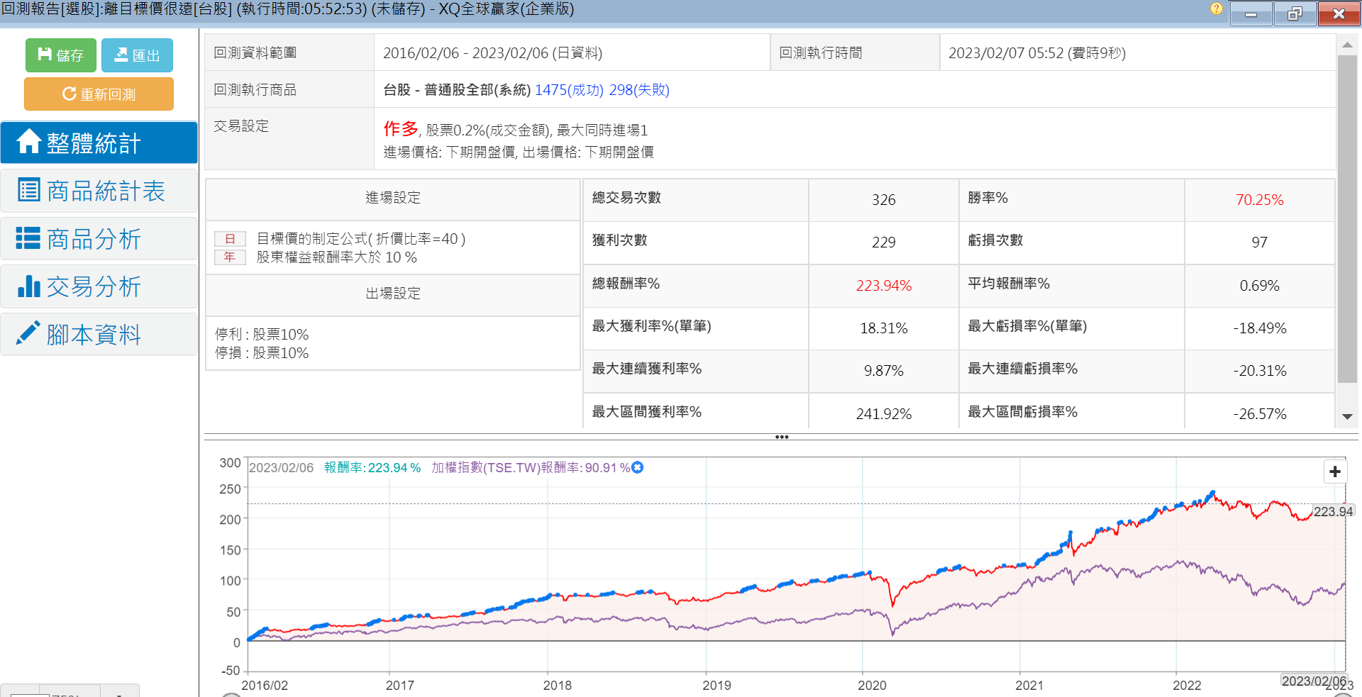 我發現,這個策略還真的蠻有用的,但交易次數有點多,所以就加上一個股東權益報酬率大於10%的過濾條件,儘量過濾掉那些商業模式可能已經過度競爭的公司,回測結果如下: