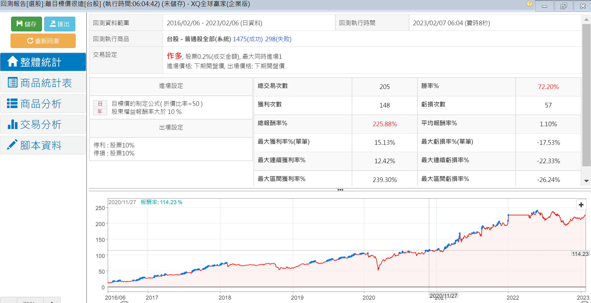 拿這個腳本去回測過去七年,停損停利均設為10%,回測的結果如下圖: