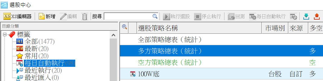 XS選股平台這次增加大量的內建選股策略,使用者以這些策略為藍圖,可以打造各式各樣不同的選股策略,透過回測,留下勝率較高的策略,然後讓系統每天自動執行,再透過每日自動執行選單中的多空兩方策略總表,可以看到那些股票符合最多不同的選股策略,這麼做,可以挑出市場中,高手們選股可能的交集。