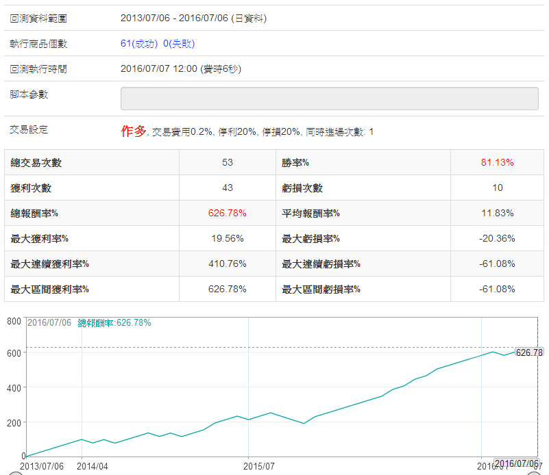 然後把這61檔股票用這個腳本去跑回測,賺兩成停利,虧兩成就停損,回測報告如下