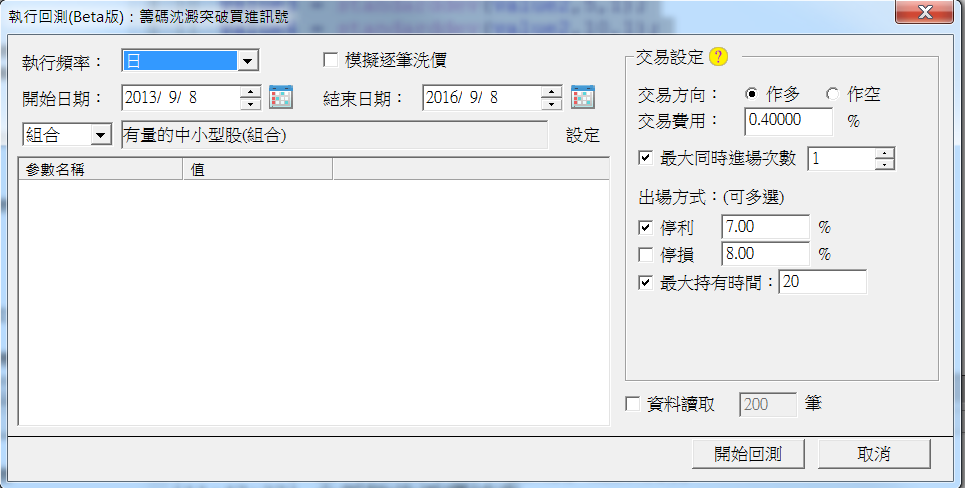 我拿有量的中小型股去回測過去三年的績效,這邊我停利設7%,沒有設停損,20天後出場