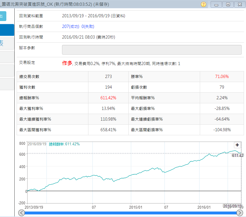 這個策略應有在有量的中小型股上面,勝率超過七成,在過去三年,207檔有量的中小型股,符合這個交易策略的次數共有273次,其中194次賺錢,79次賠錢 。
