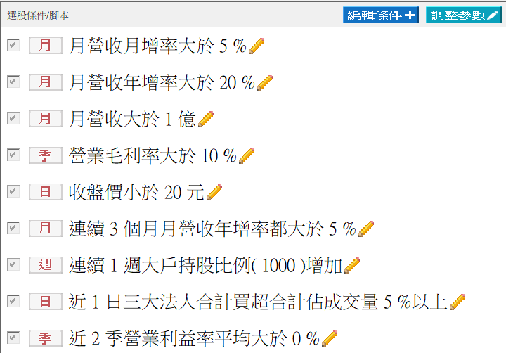 這個策略是專門從股價低於20元的股票裡,看看有沒有近一個月的營收明顯成長的公司。