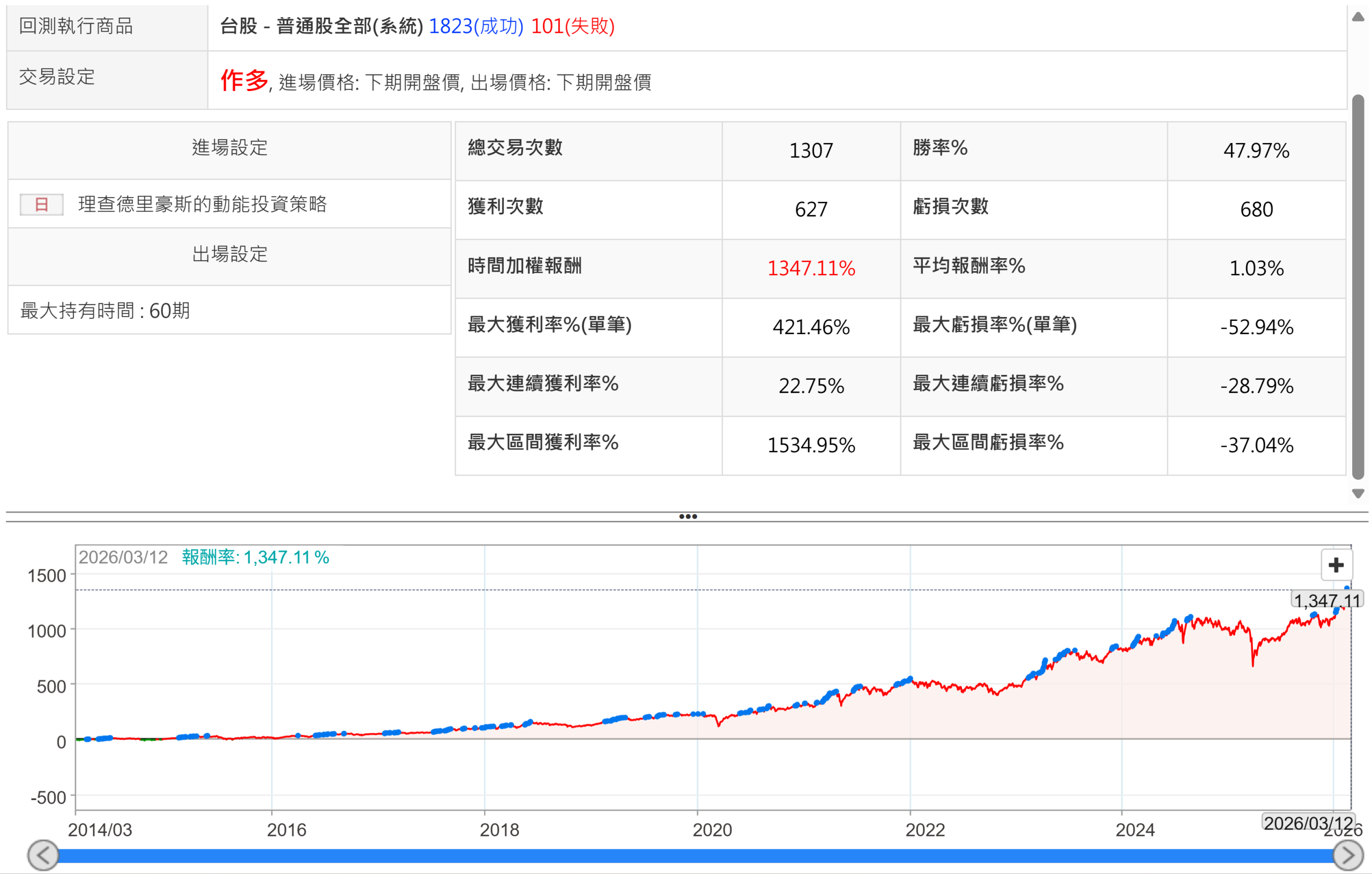 此策略忠實還原德里豪斯「買高賣更高」的動能投資精神,在台股中尋找盈餘成長加速、股價創新高且量能充沛的強勢飆股。把這腳本回測過去12年,持有60天,回測報告如下圖