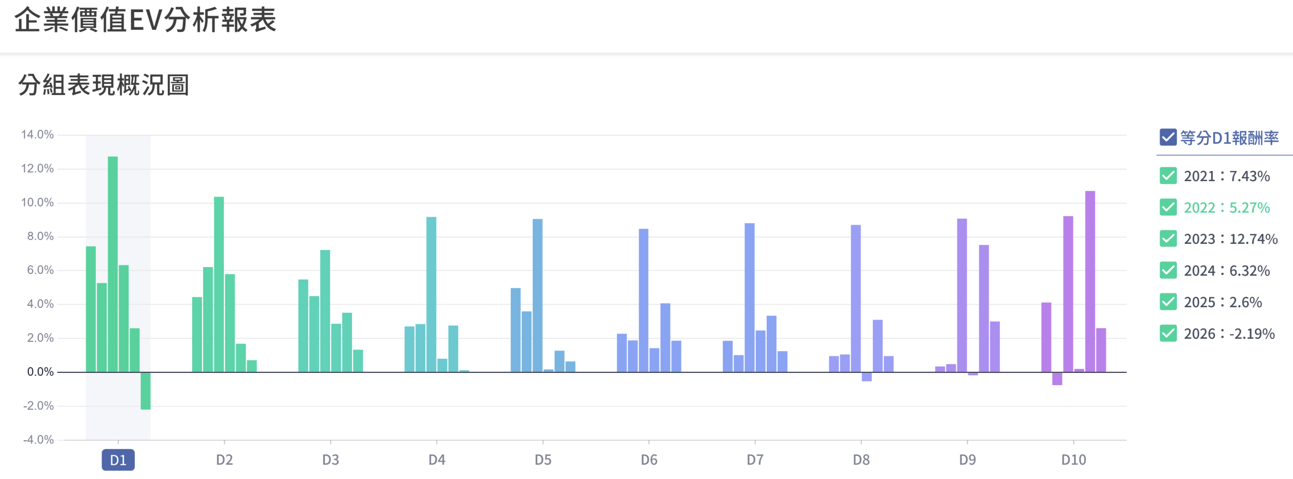 例如企業價值這個因子,分成十組,各組的報酬率如下圖