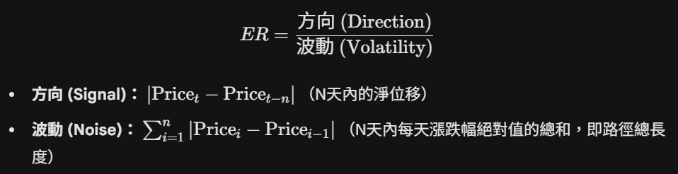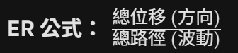 - 雖然價格位移(分子)變大了,但如果這次突破是伴隨著劇烈的上下刷洗(分母 Volatility 更大),ER 值反而會很低。