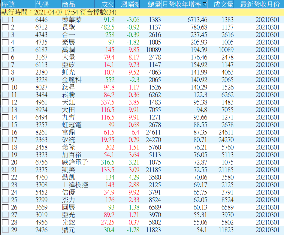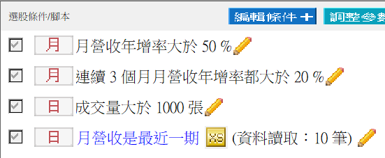 其中月營收是最近一期這個條件,是要確定挑到符合上面營收成長條件的日期,是在最近一個月營收公佈的那一天,這個腳本如下