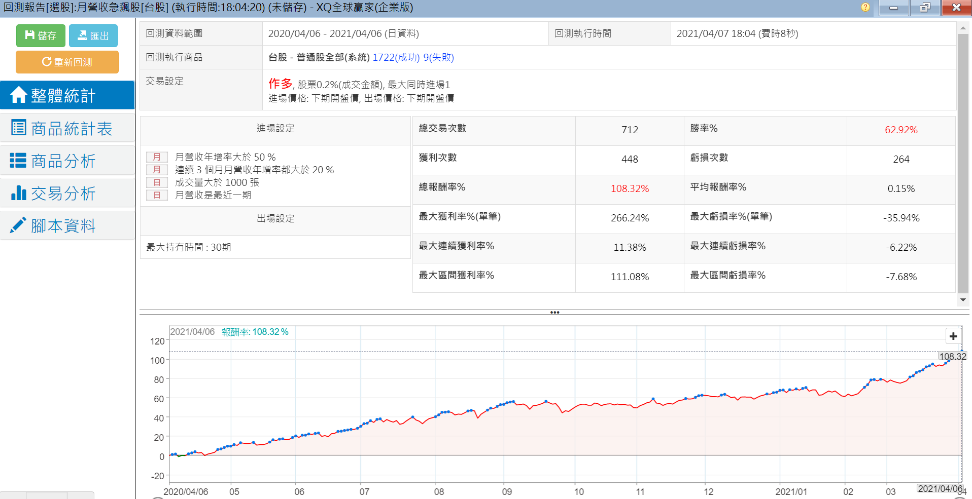 但如果是這個選股策略去回測比較長時期,績效其實沒有那麼好,這種策略蠻合適在大資金行情中,市場資金急著尋找強而有力的基本面支撐題材,不過我會推荐大家在每個月營收公佈期間,跑這個腳本,去找出那些過些因為各種因素而讓月營收有明顯好轉的公司,因為這些公司極可能就是那種先前默默耕耘,現在產品終於開始得到市場肯定的公司,這樣的選股邏輯,是有道理的,剩下的問題只是我們能多早挑中這樣的公司。