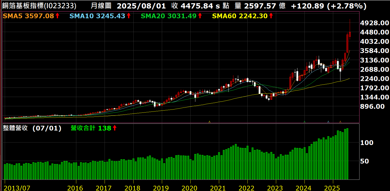 例如最近非常熱門的銅箔基板行業,如果從整體月營收來看,其中從2023年中起,這個產業就開始迎接新的上昇趨勢,且在2024年中創歷史新高後仍然持續的走高。