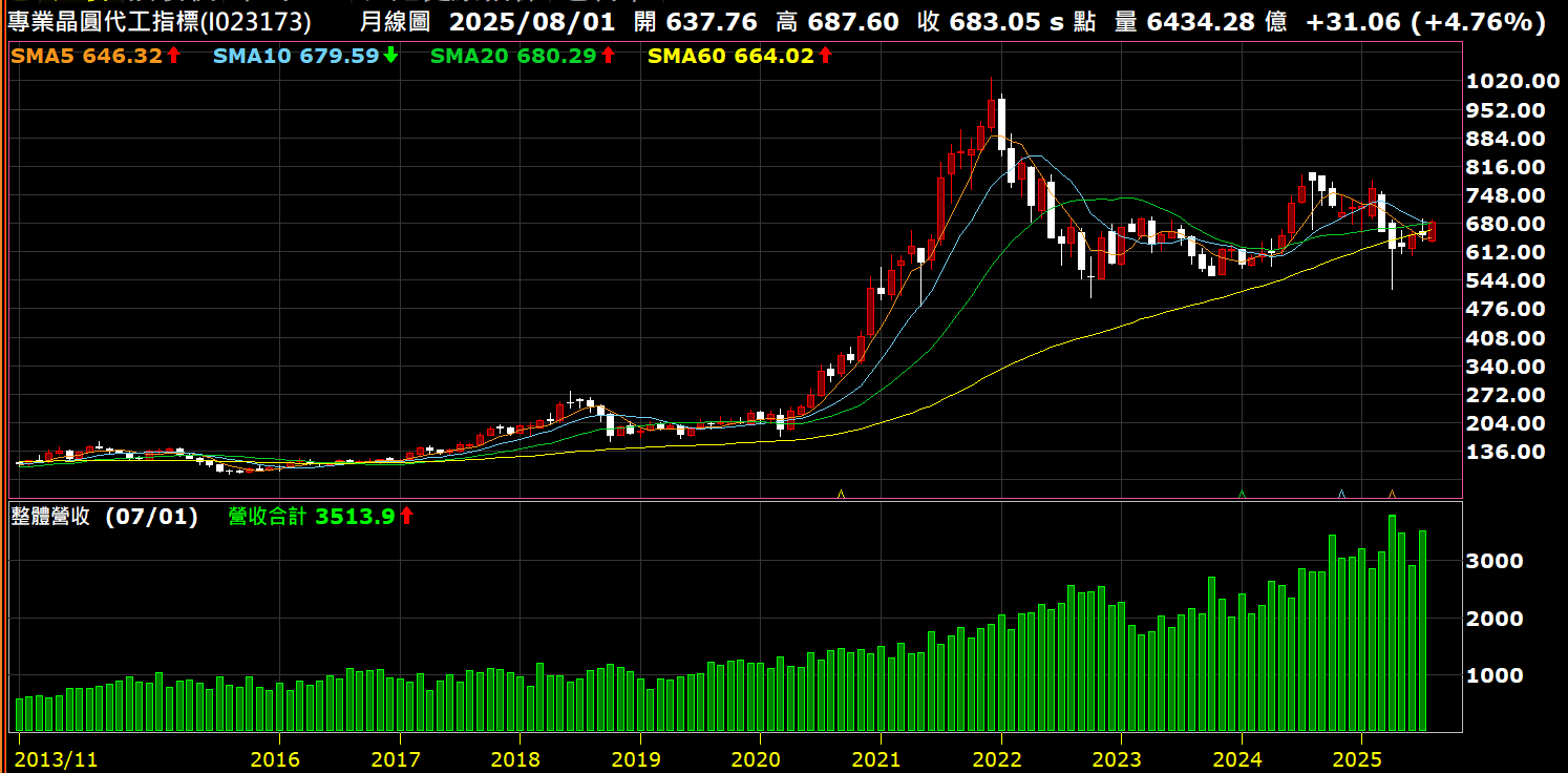 下面這張圖是晶團代工指標跟其成份股的整體月營收的長期對照圖