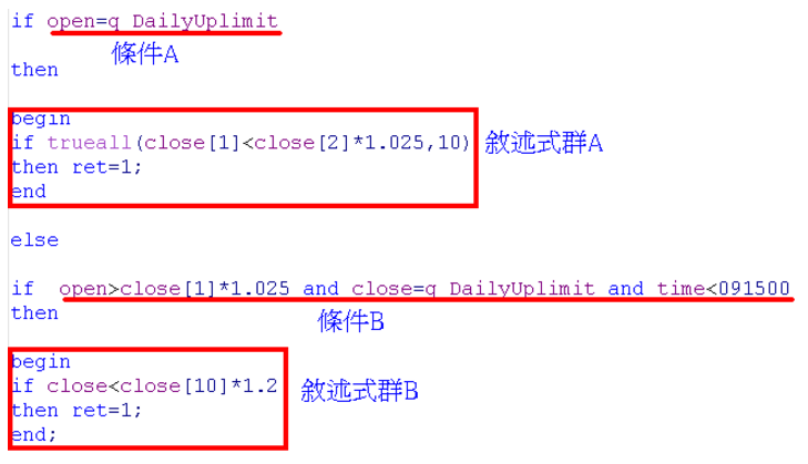 這樣的流程控制算是if ….then裡最複雜的,用白話文說就是如果……那就開始一連串的動作,反之如果不符合上述條件,就開始進到第二個如果…..那就開始另一連串的動作 以上述的例子的引申為例,我們也可以把上面的例子改寫成以下的腳本 :這腳本的意思是當一開盤就漲停時,我們幫它加一個條件:如果過去十根K棒漲幅都沒有超過2.5%就觸發, 至於對於那一些開盤沒有馬上漲停,但開高後在9:15之前就漲停的股票,如果過去十天漲幅不到兩成,就觸發警示。 這樣的流程基本上就可以同時COVER各種觸發的條件。