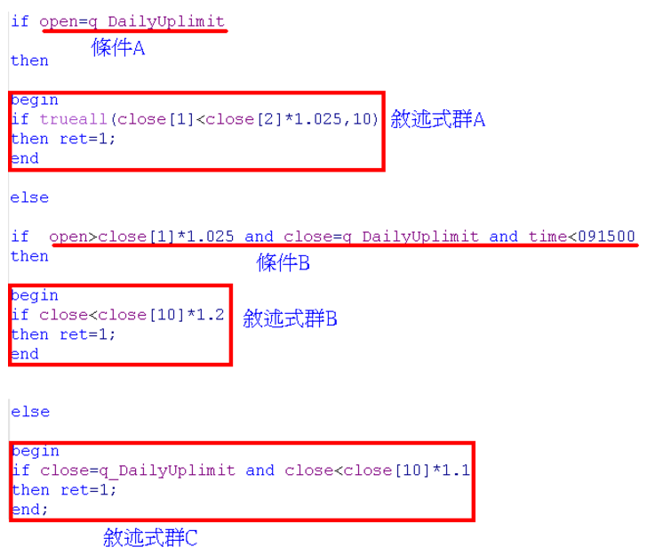 從上述的例子,我們就可以了解,這樣的流程控制,可以讓使用者像剝洋?一樣,把一個結果(漲停)安排出不同情境下的不同觸發但書。