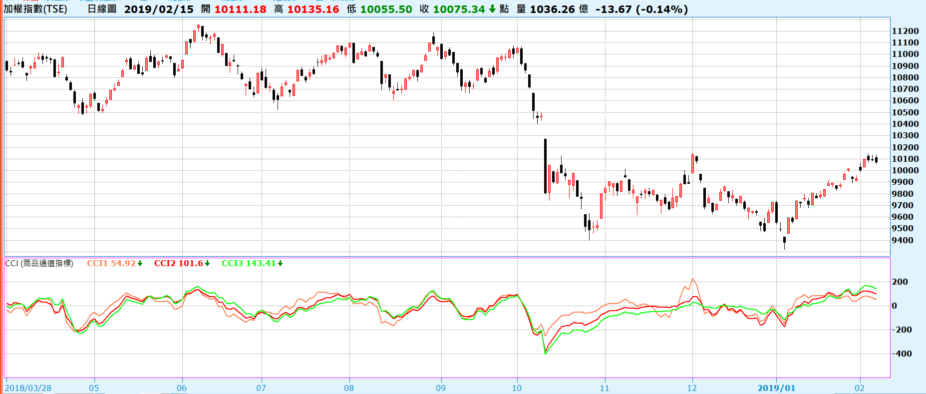 // XQ: CCI指標 // input: Length1(14), Length2(28), Length3(42); SetInputName(1, "天數一"); SetInputName(2, "天數二"); SetInputName(3, "天數三"); Plot1(CommodityChannel(Length1), "CCI1"); Plot2(CommodityChannel(Length2), "CCI2"); Plot3(CommodityChannel(Length3), "CCI3");