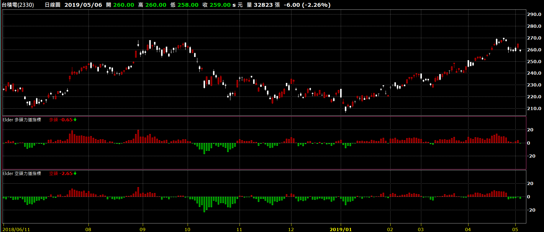 一個是Elder多頭力道指標,另一個則是Elder空頭力道指標