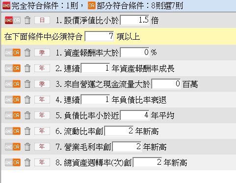 我試著用這樣的精神用xs的選股平台去設定選股條件,條件如附圖,但九大條件中的第四點跟第七點無法用選的,所以我用寫了一個選股腳本如下: