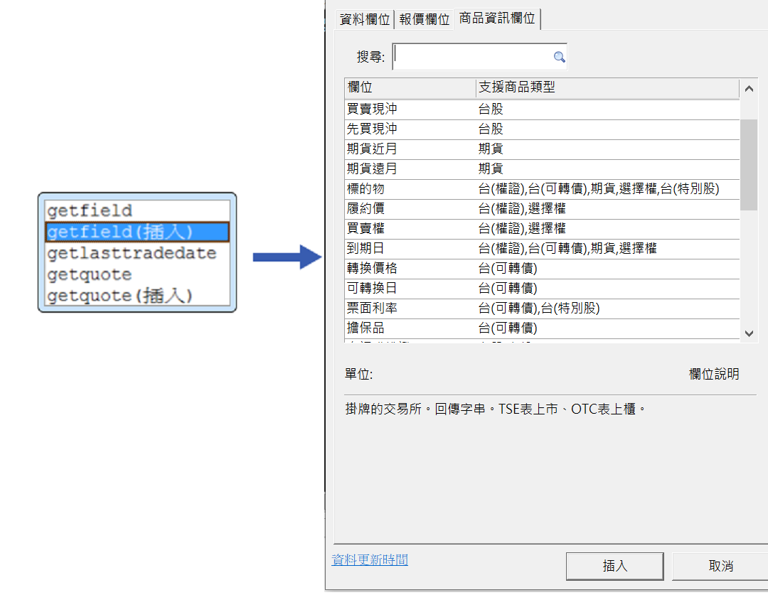 在撰寫腳本時,當您需要使用這些台股特有的欄位時,只要在編輯器中打一個英文字母g,不管大小寫,編輯器都會跳出一個如下面附圖中的視窗, 只要您選取getfield(插入),系統就會跳出一個選取欄位的視窗,讓您直接挑選要使用的欄位。