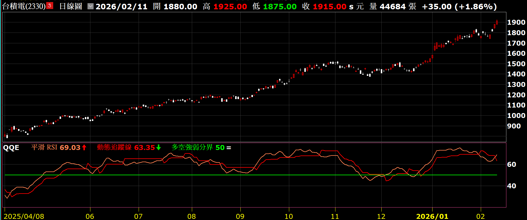 當股價突破新高,但 QQE 的「平滑 RSI 線」未能向上突破「動態追蹤線」,甚至發生背離,這就是強烈的假突破警告。系統可以自動發出警示:「動能未獲波動率確認,慎防誘多」。 - 黃金交叉與死亡交叉 (精準買賣點):