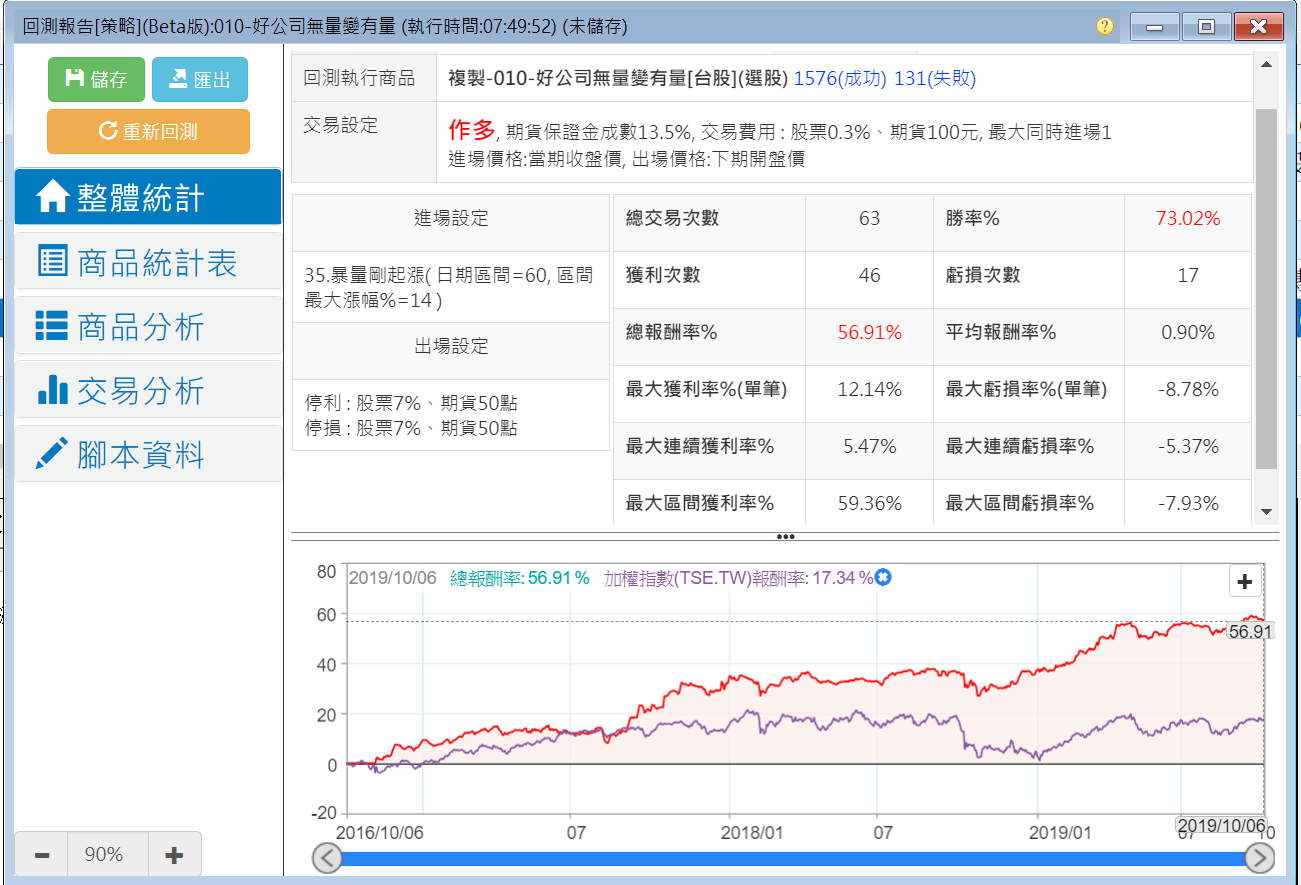 拿這個策略雷達去回測,停損停利都設為7%,回測過去三年,報告如下