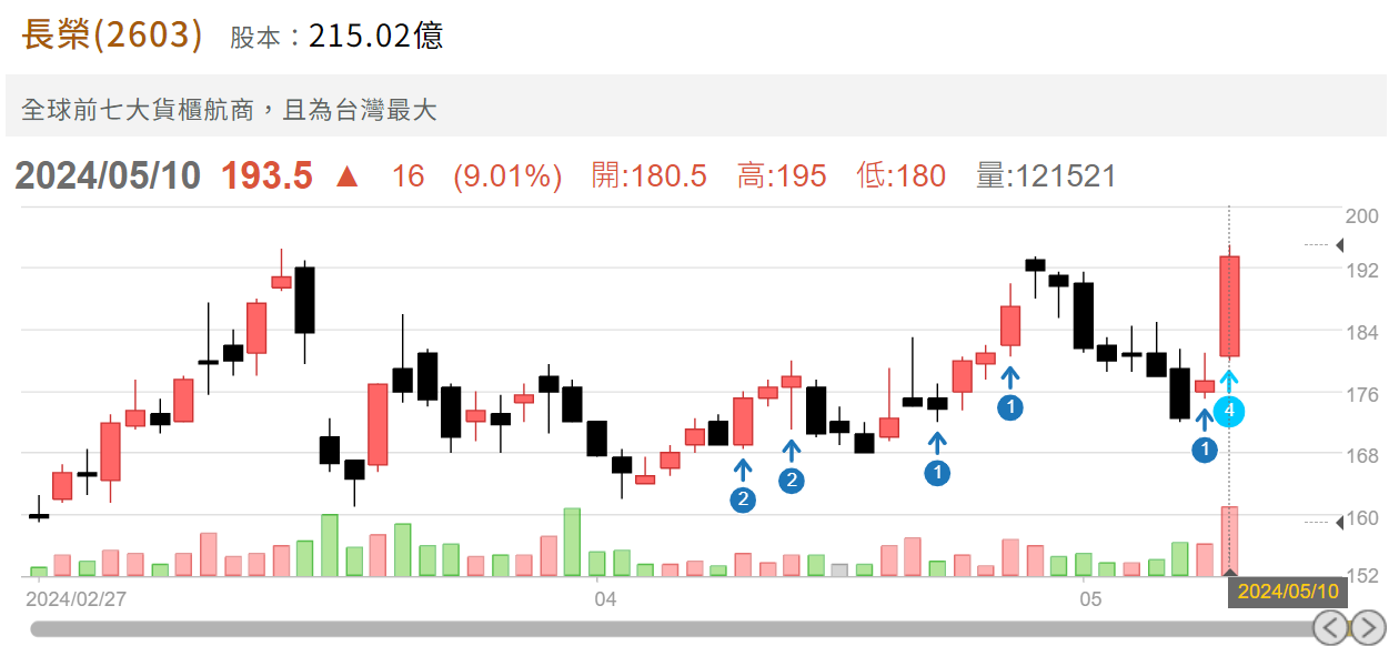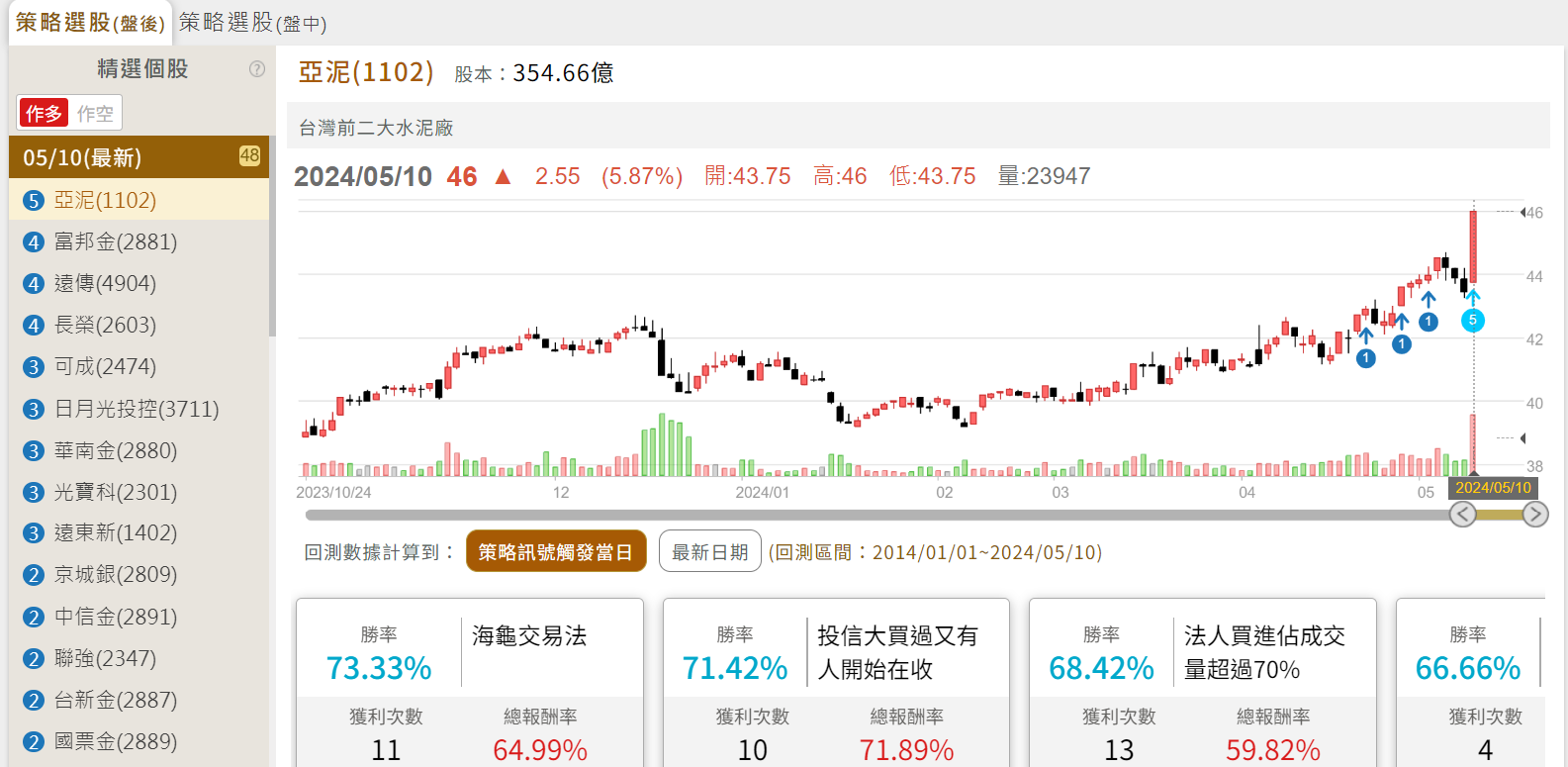 要跟大家報告的是,根據我自己的使用經驗,這個功能有其參考之處,特別是如果連續數日,不同策略都觸發作多訊號時,還蠻值得注意,例如這兩天大漲的長榮,自四月中旬以來就有蠻多次觸發作多訊號