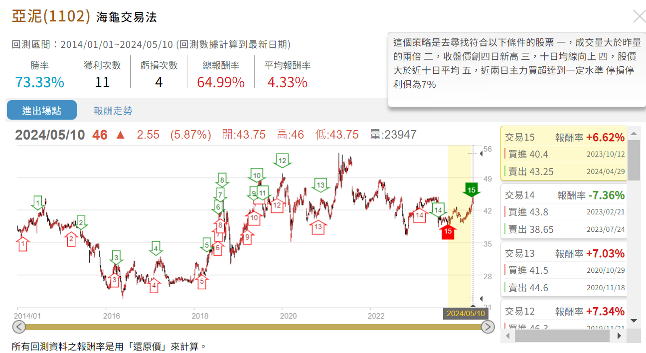 這個畫面會有策略的說明,過往出現過的觸發位置及最後的出場位置,這些策略停損停利都是設為7%。