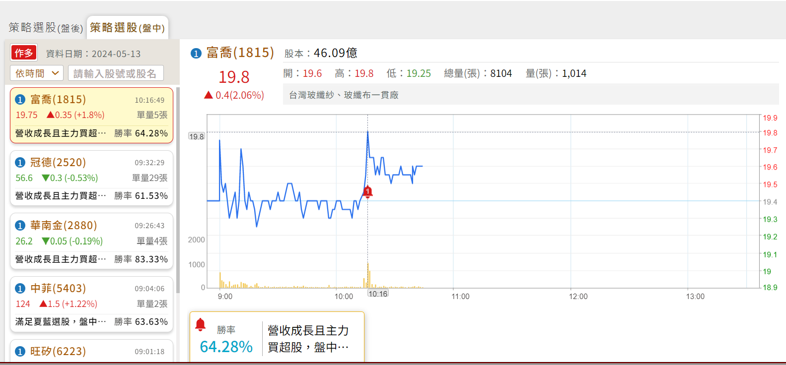 左邊是盤中觸發的個股名稱,右邊則是分時圖,並且在觸發的時點作標示