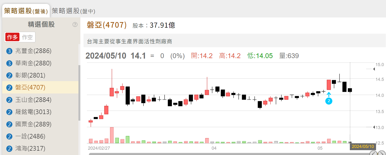 我們把先前介紹過的盤後及盤中策略,分成作多及作空,每天把符合那些策略的個股,依符合策略數列出來,User可以看看這些策略與K線對照的相關位置,下面則是符合的策略名稱及回策報告。