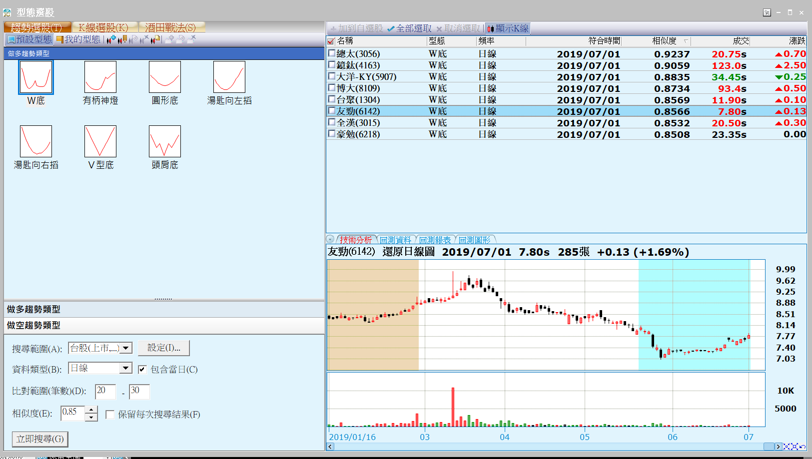 在策略選單底下有一個型態辨識的功能,因為很多投資者非常重視K線的型態,這個功能可以讓使用者畫出自己希望的型態,然後讓電腦每天畫出符合這些型態的標的,於是要挑W底,頭肩底的股票,不用一檔檔的看K線圖,按個鍵,符合特定型態的股票就會列出來。