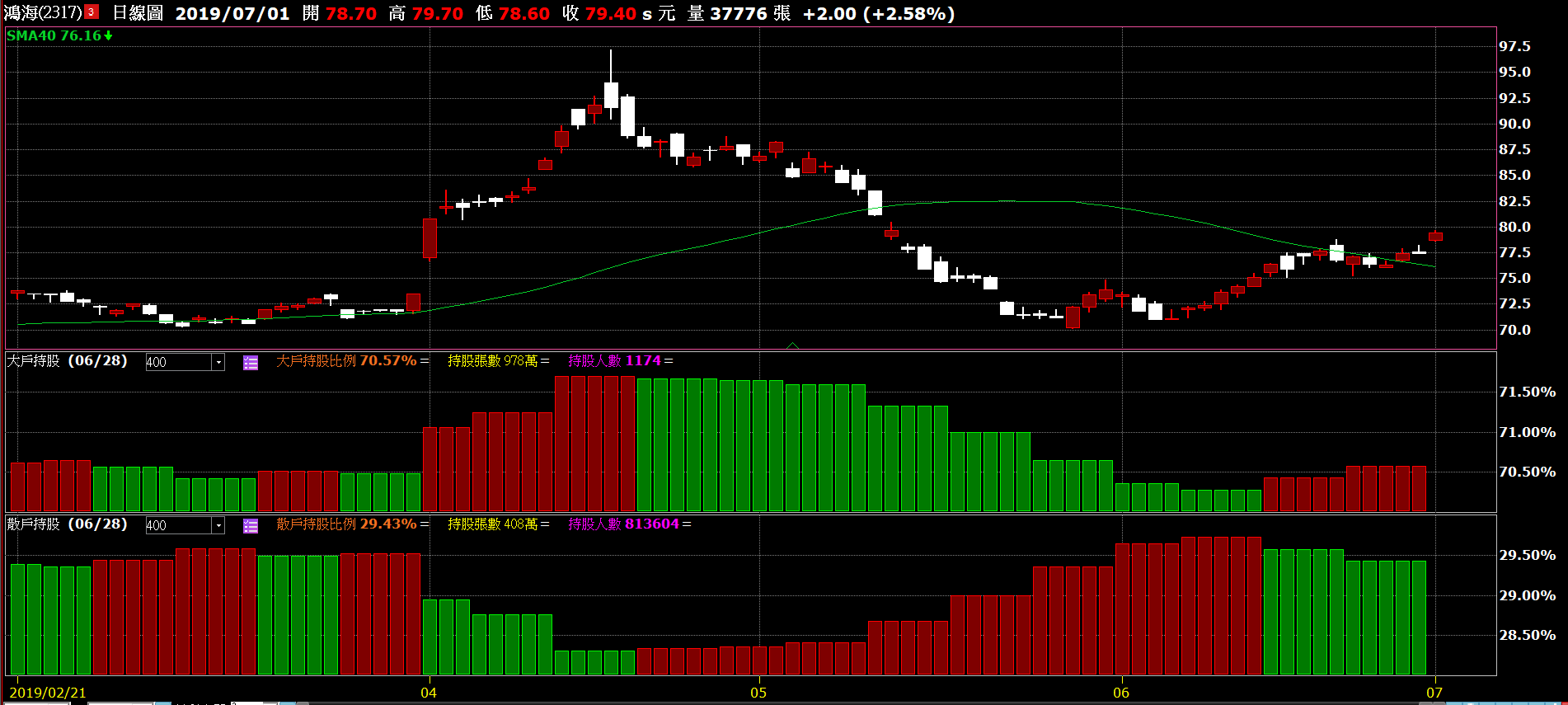 由於有XS的程式語法當後盾,所以XQ操盤高手可以很快的,根據客戶的反映,增加各種的系統內建指標,以下圖為例,像是從集保每週公告數據計算出來的大戶及散戶指標,就是一個例子。